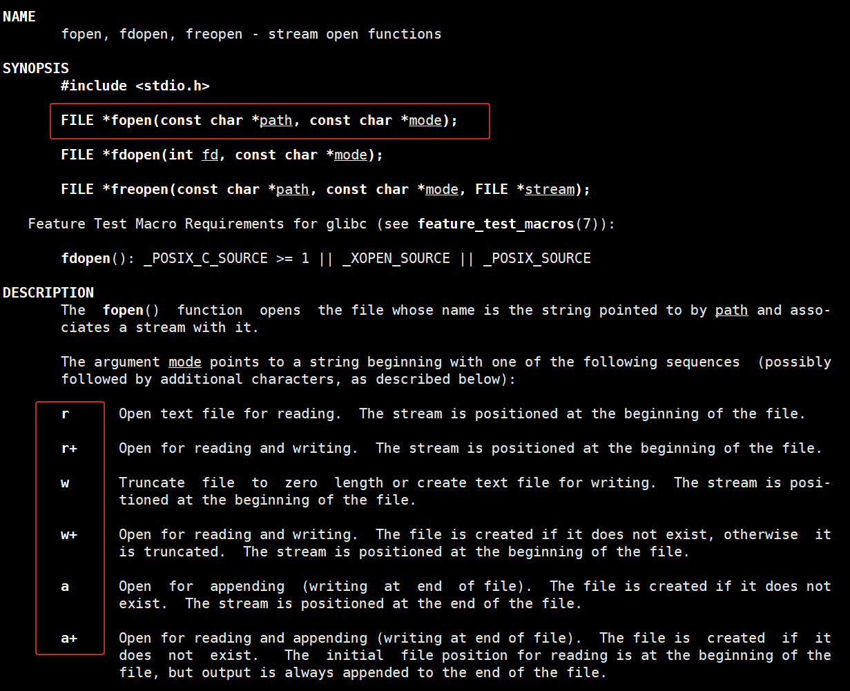 再看下面的关于 mode 参数的不同取值 : mode 的开头字符决定了文件执行的基本行为: