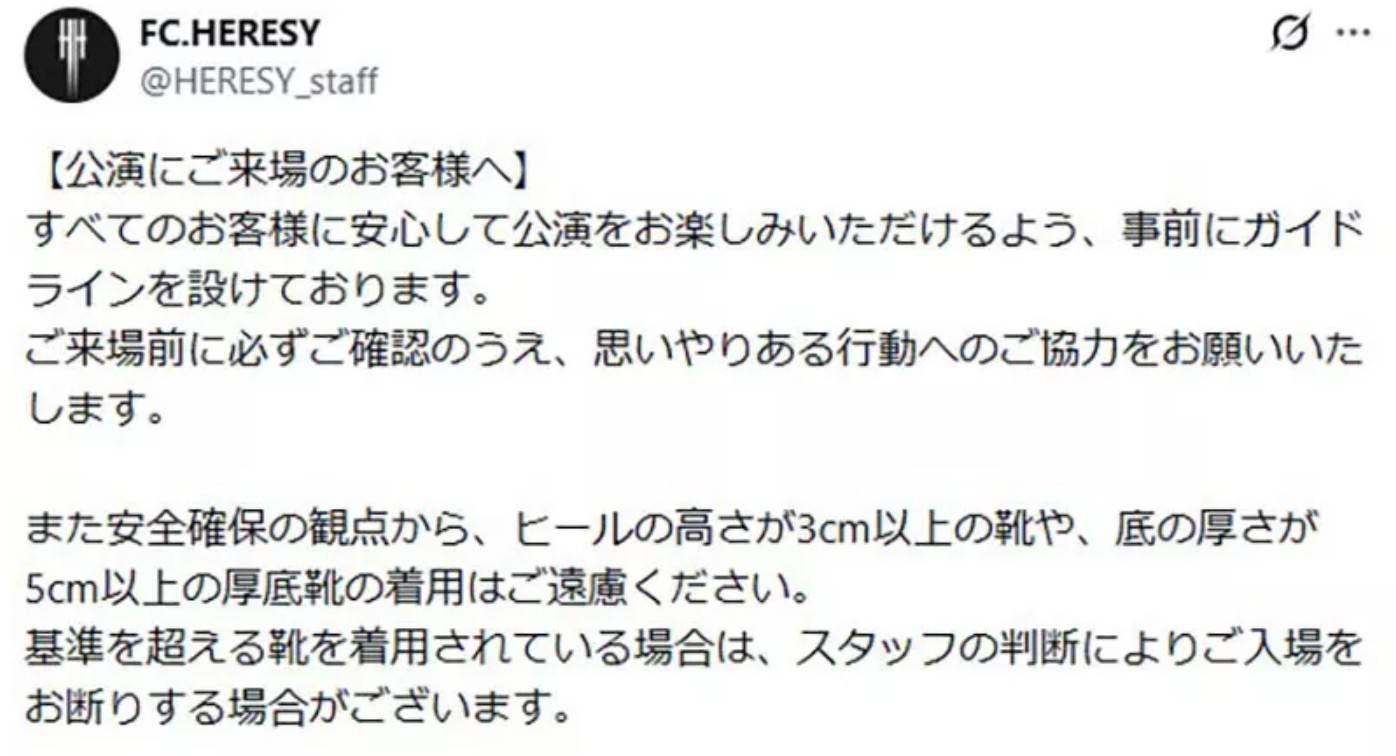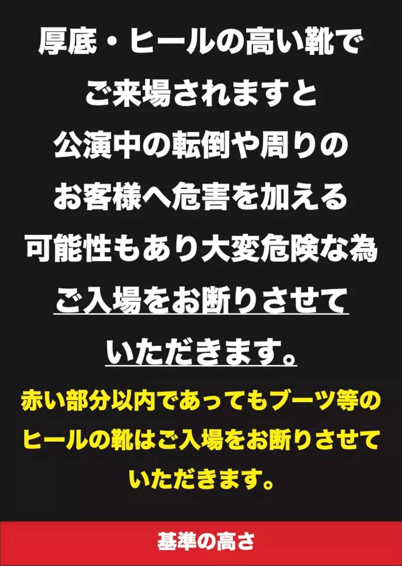 “穿着厚底或高跟鞋入场,可能在表演期间跌倒,或是伤害周围的观众,非常危险,因此将拒绝入场。