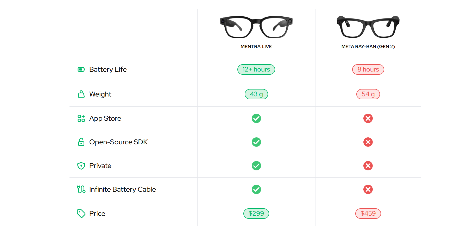 在硬件规格方面,Mentra Live 采用联发科 MTK8766 芯片,搭载一枚 1200 万像素、视场角 119 度的摄像头,支持 1080p 视频录制,并内置三枚麦克风和立体声扬声器。 电池容量为 2200 mAh,官方宣称续航可超过 12 小时,长于 Meta Ray-Ban 第二代眼镜的标称续航;机身重量为 43 克,也略轻于后者。 在价格上,Mentra Live 的定价为 299 美元,相比起约 459 美元的 Meta Ray-Ban(第二代)更具价格优势。