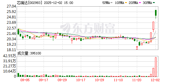 12月2日,安徽芯瑞达科技股份有限公司(以下简称“芯瑞达”)二级市场表现亮眼,截至下午收盘,该公司股价报收25.08元/股,涨幅为5.16%。在此之前的两个交易日(11月28日、12月1日),芯瑞达连续涨停。