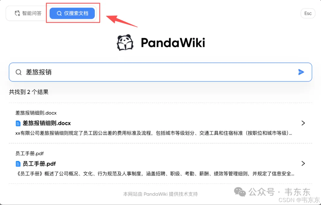 首先可以注意到的就是,PandaWiki 是同时支持了仅检索文档和智能问答两种模式。保留了仅检索文档这个设计,我觉得其实很实用。