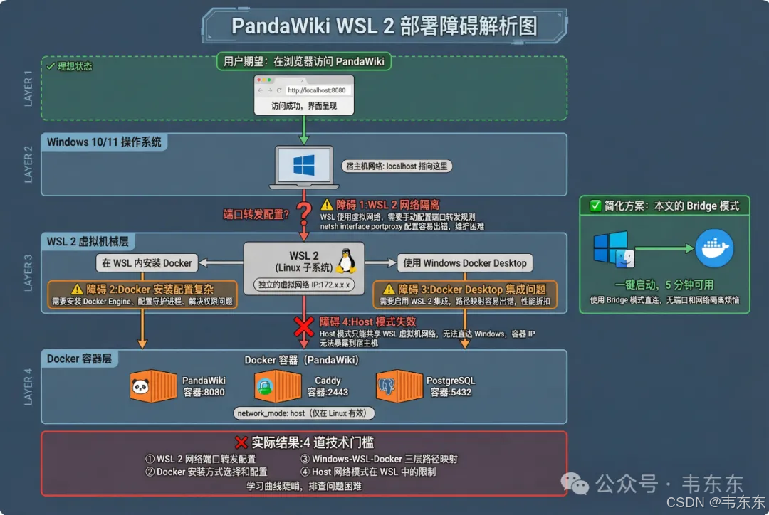 那在 Windows 上用 WSL 行不行?理论上可以,但实际操作起来相当折腾。需要先安装配置 WSL 2(Windows Subsystem for Linux),然后在 WSL 里安装 Docker,或者让 WSL 使用 Windows 的 Docker Desktop(需要额外配置)。需要注意的是,网络配置容易出问题,WSL 和 Windows 主机之间的端口转发经常踩坑。对于不熟悉 Linux 的用户,这个学习曲线也很陡峭。