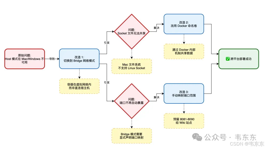 但问题也随之而来,network_mode: host在 Mac 和 Windows 上没法用。因为Docker Desktop 在这两个平台上运行的架构完全不同,Linux里Docker 直接运行在宿主机内核上,Host 模式让容器与宿主机共享同一个网络命名空间。而Mac/Windows里,Docker 是运行在一个轻量级 Linux 虚拟机里,Host 模式只是让容器共享虚拟机的网络,而不是你的 Mac 或 Windows 的网络。