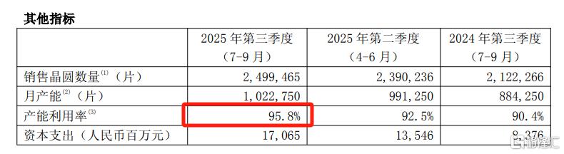 从产能方面来看,中芯国际月产能由2025年第二季度的99.125万片折合8英寸标准逻辑增加至2025年第三季度的102.275万片折合8英寸标准逻辑。中芯国际的Q3产能利用率进一步提升至95.8%,同比增长17.8%。