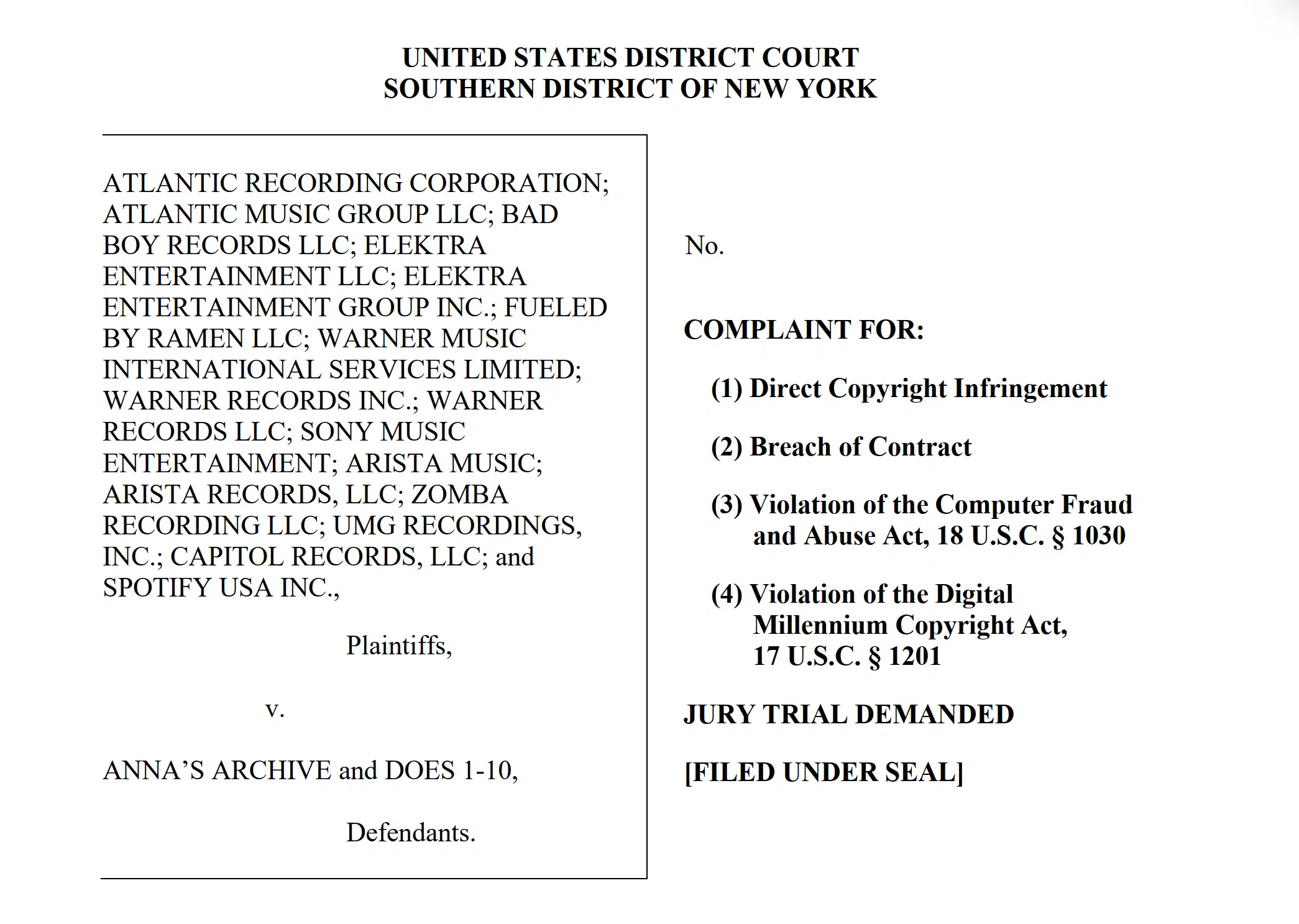 在正式起诉的同时,Spotify 及唱片公司还向法院申请了临时限制令和初步禁令,试图在对方采取反制措施之前将 Anna’s Archive 从线上移除。 为了不惊动被告,这些文件一开始被申请“密封”处理,Anna’s Archive 方面当时并未被通知。 原告在申请中强调,必须在对方得知之前采取行动,“以防 Anna’s Archive 预先挫败我们所寻求的措施”。