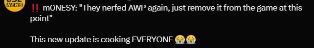被国内玩家誉为“孩神”的猎鹰明星狙击手m0NESY也直言不满:“他们又削AWP了,干脆直接删掉算了。”