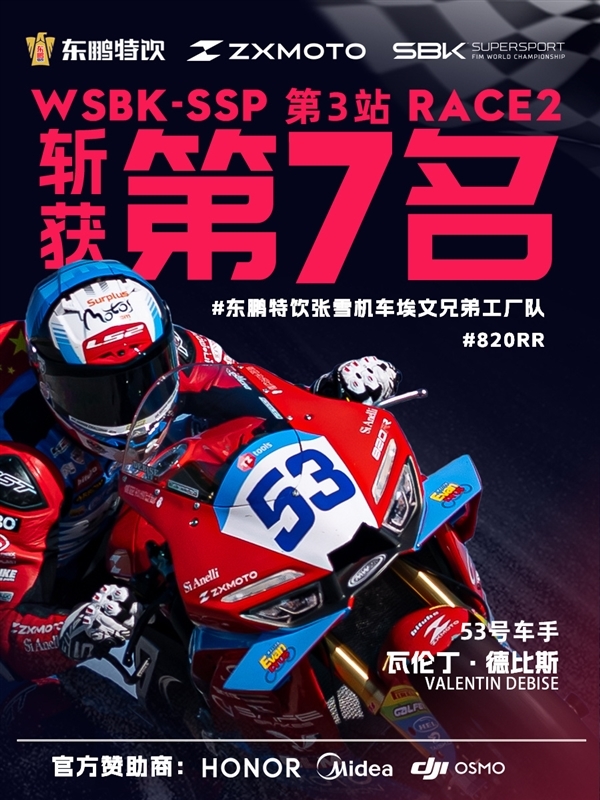 同时官方也正式晒出战报:53 号车手德比斯在第二回合正赛位列第 7。