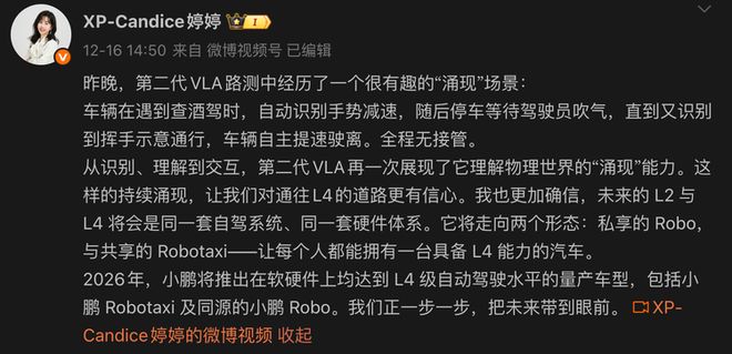 发布这段视频的是小鹏汽车智驾产品负责人袁婷婷。她给这条微博配的文字是“VLA2.0涌现场景”。