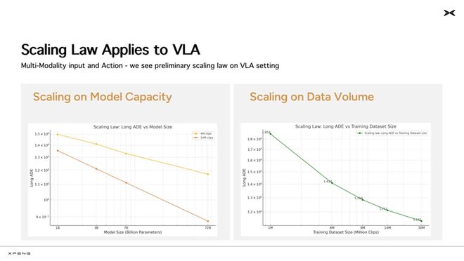 更重要的是,小鹏团队宣布他们在10亿、30亿、70亿、720亿参数的模型上都观察到了明显的Scaling Law效应。自动驾驶模型的性能随着参数的增加而明显提升。小鹏官宣这是行业内首次明确验证规模法则在自动驾驶领域持续生效。