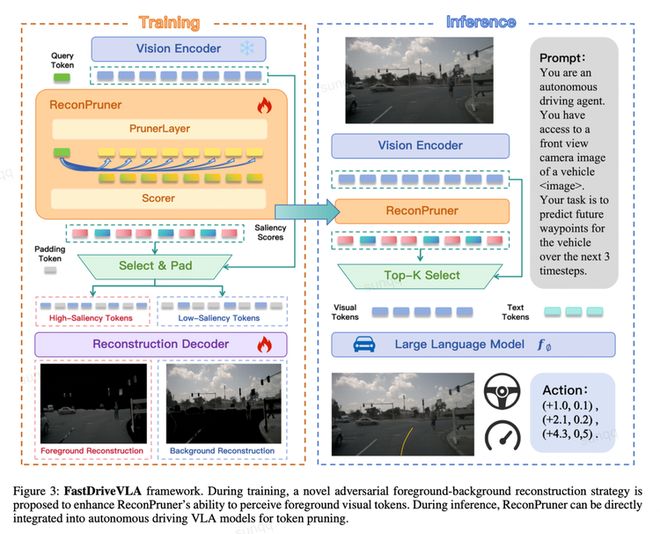 论文提出了一个专为端到端自动驾驶VLA模型设计的视觉Token剪枝框架。核心思路是区分“前景”和“背景”。对于自动驾驶来说,道路、车辆、行人、交通标志、交通障碍物是前景,天空、远处的建筑是背景。前景的Token要保留,背景的Token可以不要。