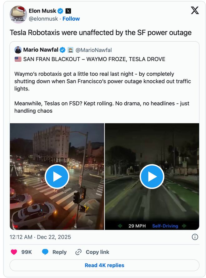 同一天,马斯克在X上发了一条推文:Tesla Robotaxis were unaffected by the SF power outage(特斯拉的Robotaxi没有受到旧金山停电的影响)。