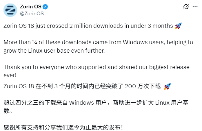 Zorin Group在其官方账号上表示:“Zorin OS 18在不到三个月内下载量突破200万次,超过四分之三的下载来自Windows用户,这进一步扩大了Linux用户群体。感谢每一位支持和分享我们有史以来最大发布的用户。”